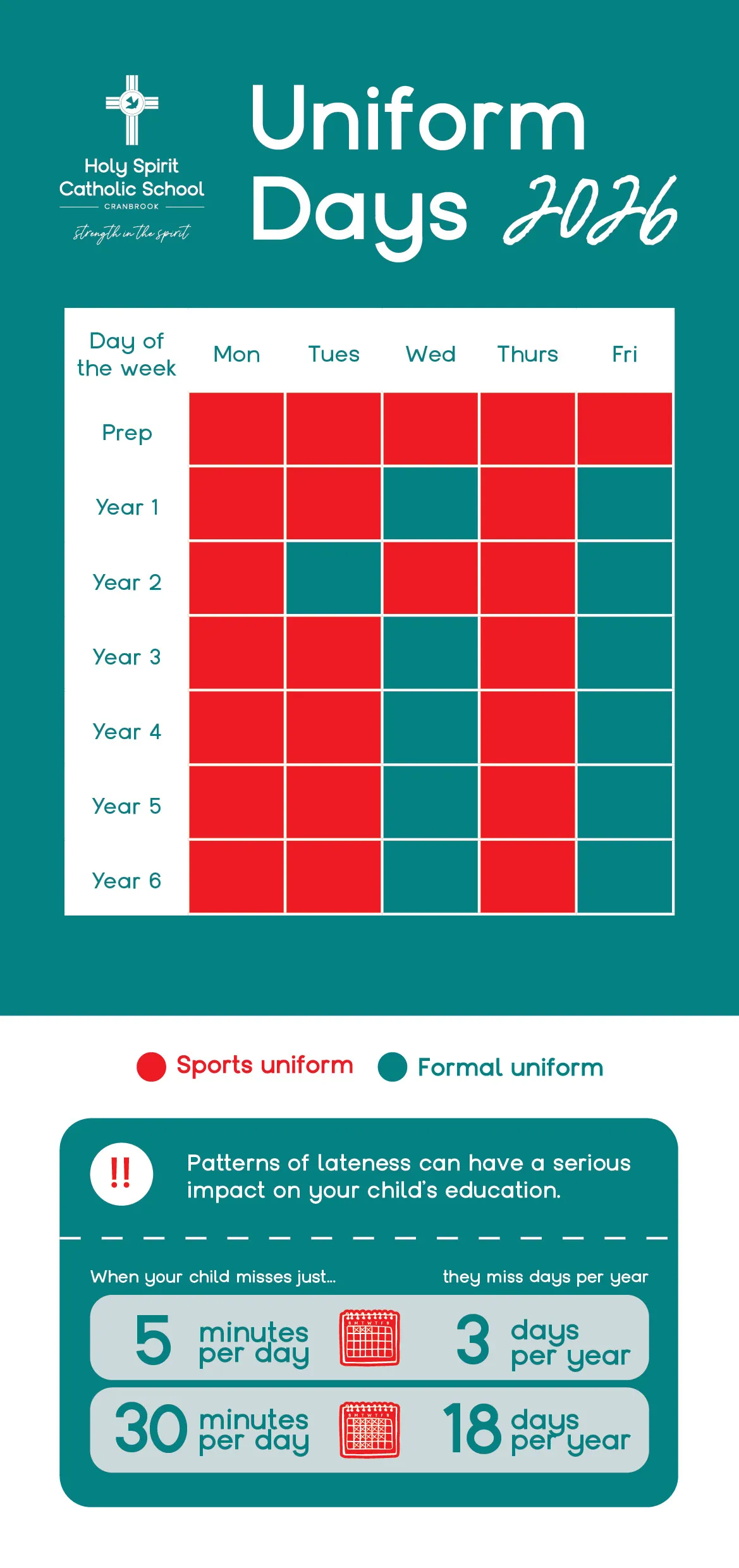 The Holy Spirit Catholic School uniform should be worn with pride on all occasions. It is the collective responsibility of all (parents, students and staff) to ensure the Code of Dress requirements apply to every student. Uniforms can be purchased from 'School Locker' which is situated at the Domain Centre.